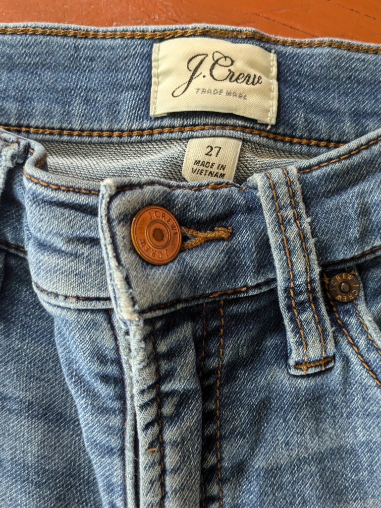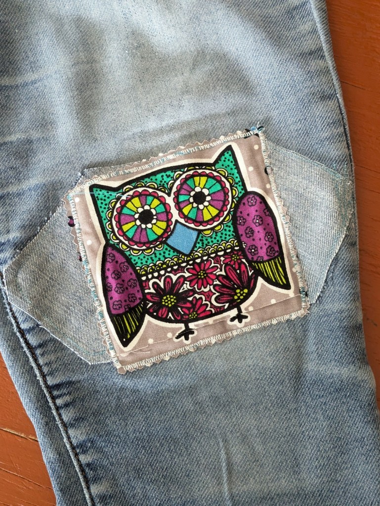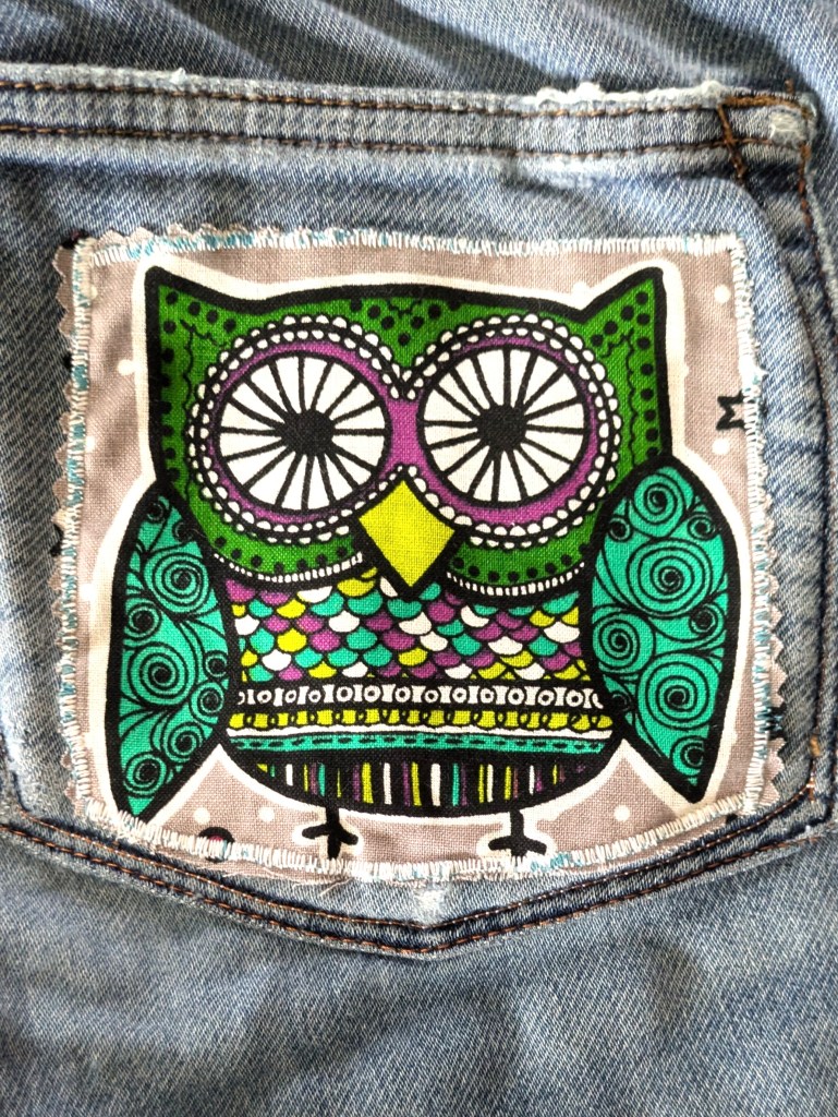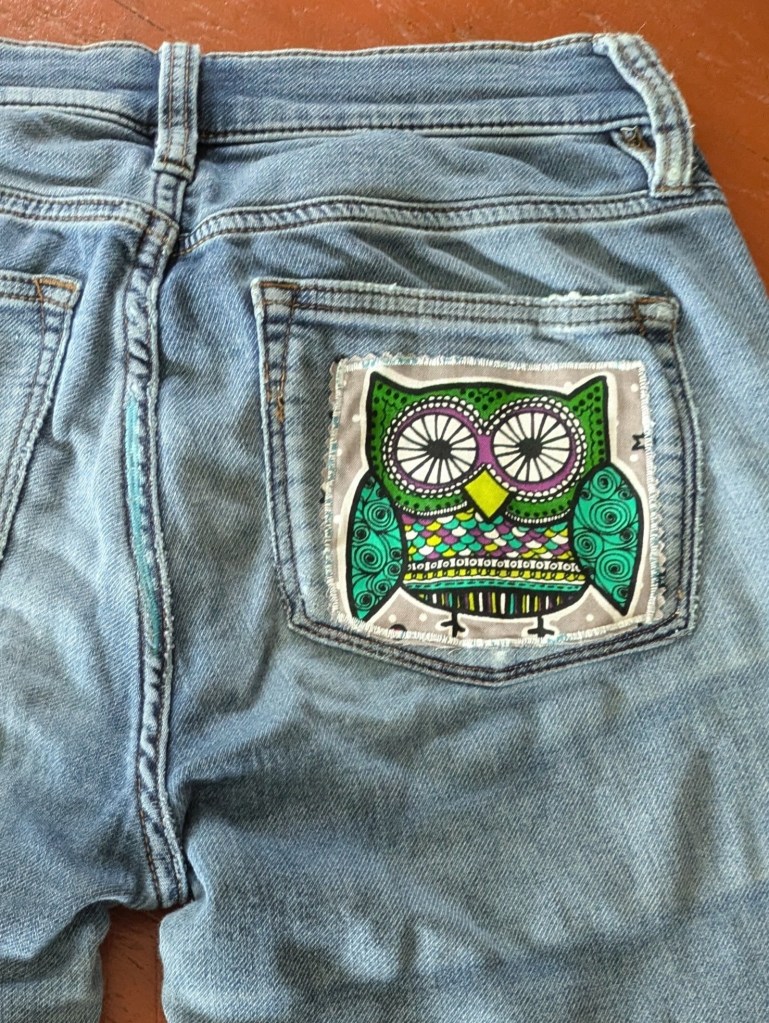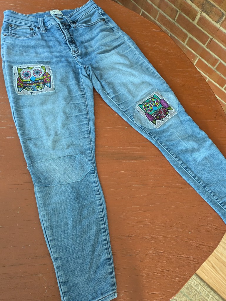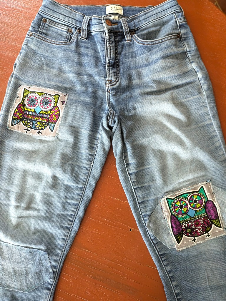 $50 – size 27 JCrew skinny low-rise jeans – brought back to life with owl patches