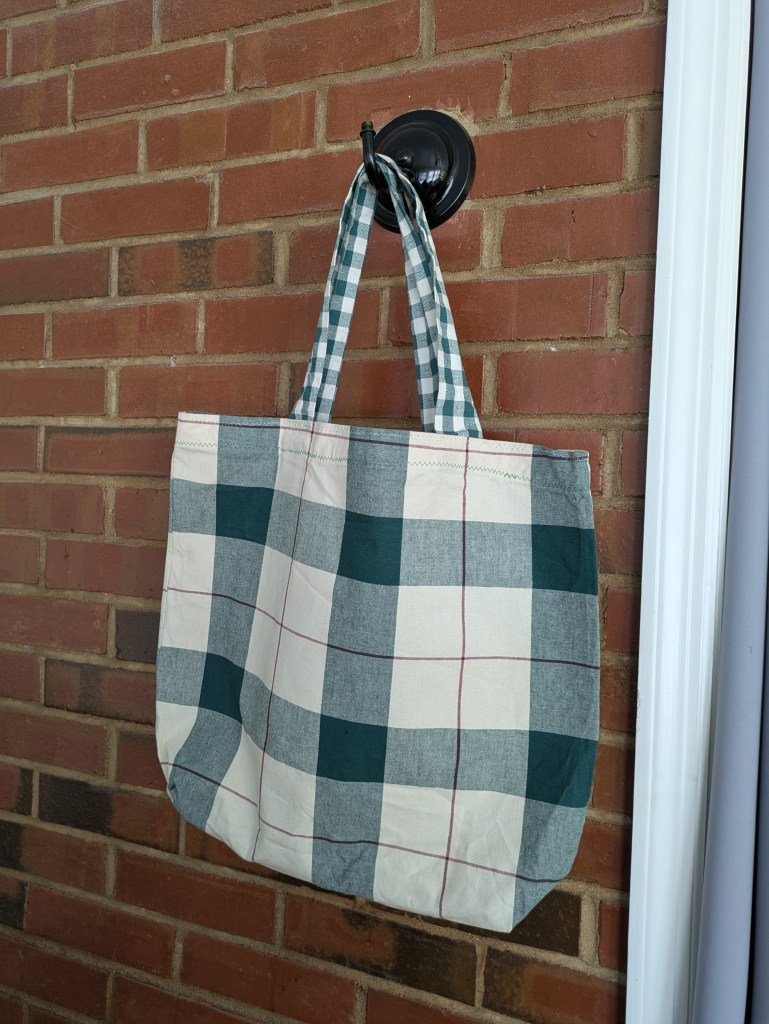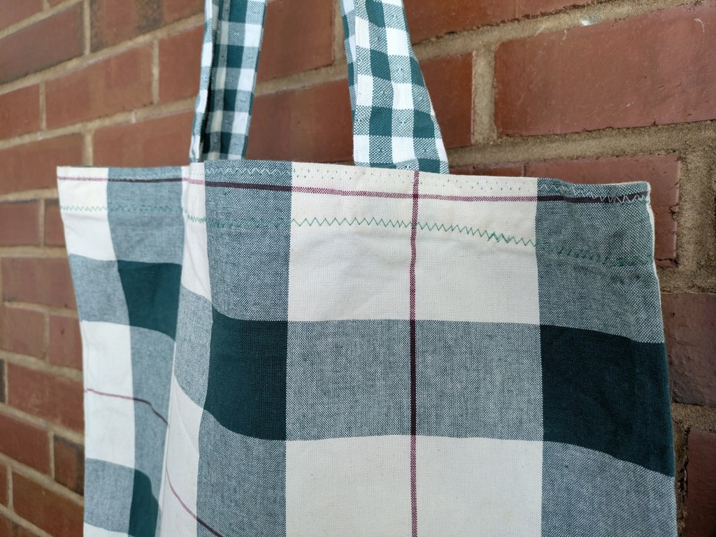 Tote bag with green checkered fabric and zig zag stitching detail. Front pocket.